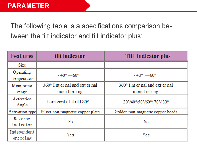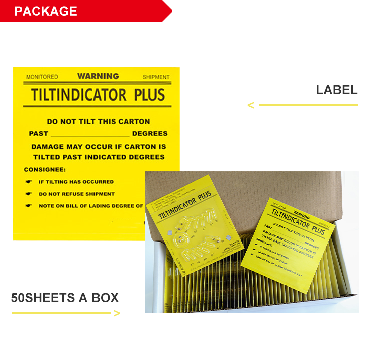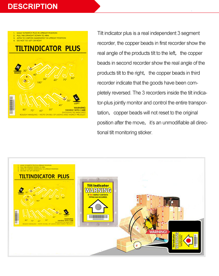 Tilt indicator plus is a real independent 3 segment recorder, the copper beads in first recorder show the real angle of the products tilt to the left,the copper beads in second recorder show the real angle of the products tilt to the right,the copper beads in third recorder indicate that the goods have been completely reversed. The 3 recorders inside the tilt indicator-plus jointly monitor and control the entire transportation,copper beads will not reset to the original position after the move,it’s an unmodifiable all directional tilt monitoring sticker.