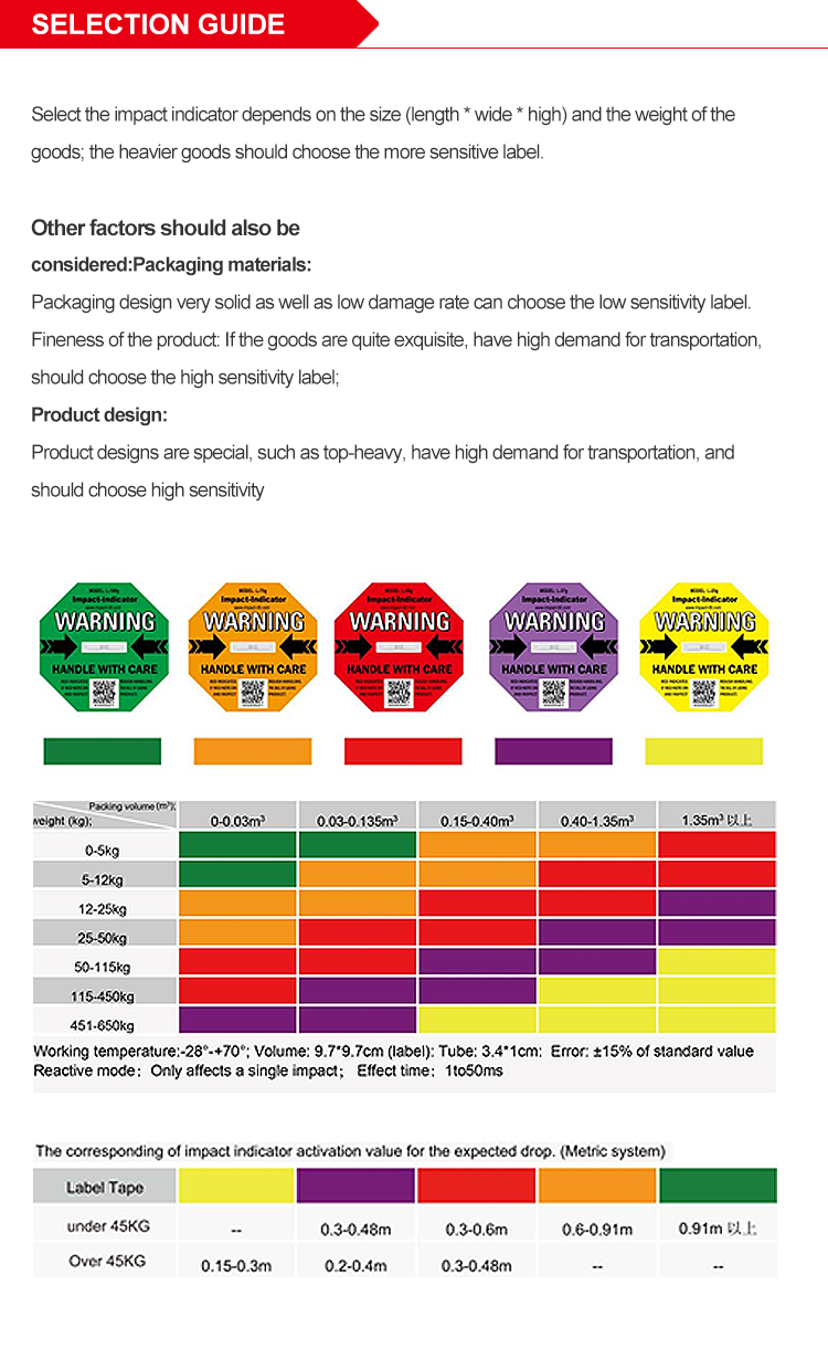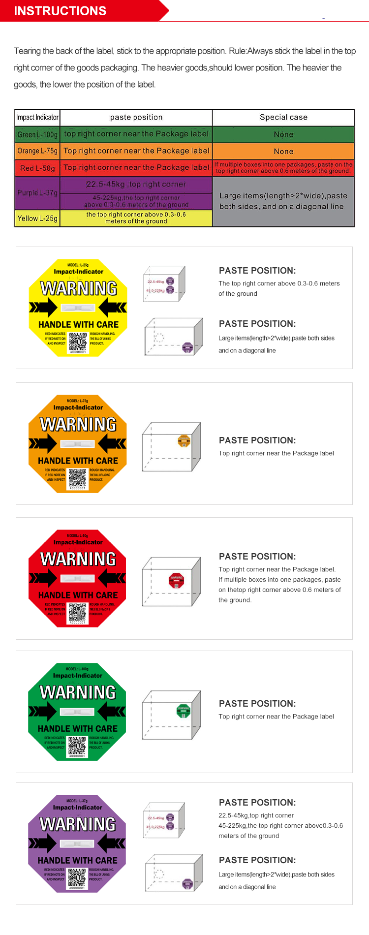 Widely used for monitoring during transport of goods, its use scope from production monitoring to the transport safety. Impact Indicator as an activity shipping labels, the operators will be asked for high attention during transport. It’s effectively ensuring the safety transport of sensitive products. This label with technical support, provide an effective reference to product packaging and distribution.