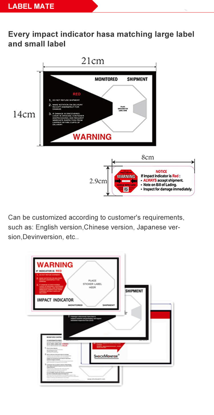 Impact indicator is a highly-visible device that will activate when an impact level exceeds a predetermined level. The tube will turn red from white. Our impact indicator are a powerful diamond stickers label affixed to the outside of the cargo box, It will work by special impact system.
